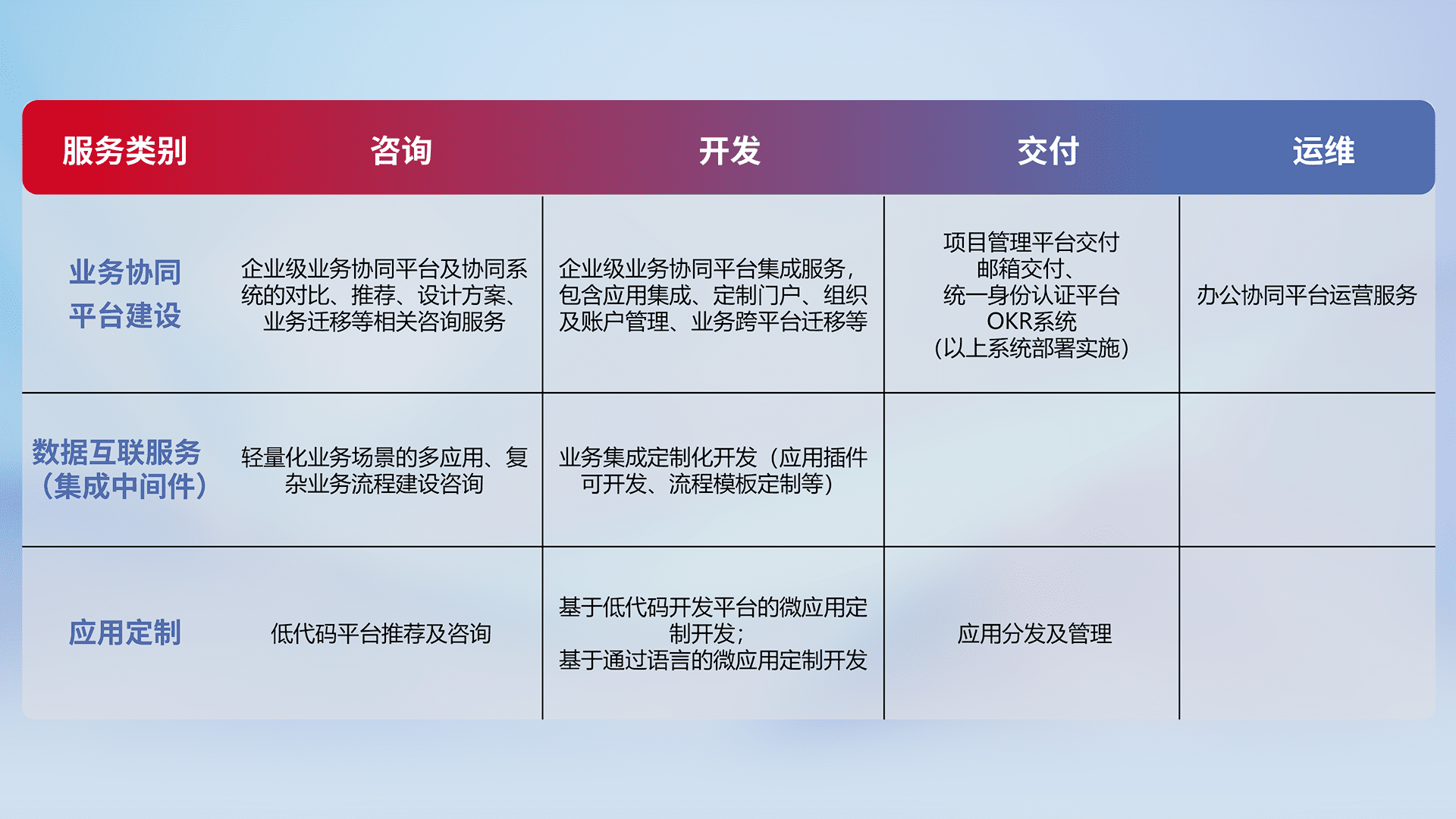 针对钉钉、、、、企微、、、IDaas等平台级产品提供产品的规划、、方案、、、交付、、、、定制化开发等服务,,实现如统一协同办公、、智能客户服务、、混合会议管理、、智能数据查询、、等业务场景,,,,实现数字化转型。。。